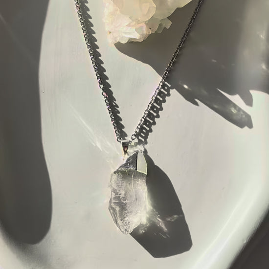 Trage einen Funken reinen Lichts. Diese Kette präsentiert eine rohe, natürliche Bergkristall-Spitze als kraftvolles Amulett. Die natürliche Form der Spitze bündelt Energie wie ein Laser und hilft dir, deine Gedanken zu fokussieren, deine Intention zu manifestieren und deinen Geist zu klären.