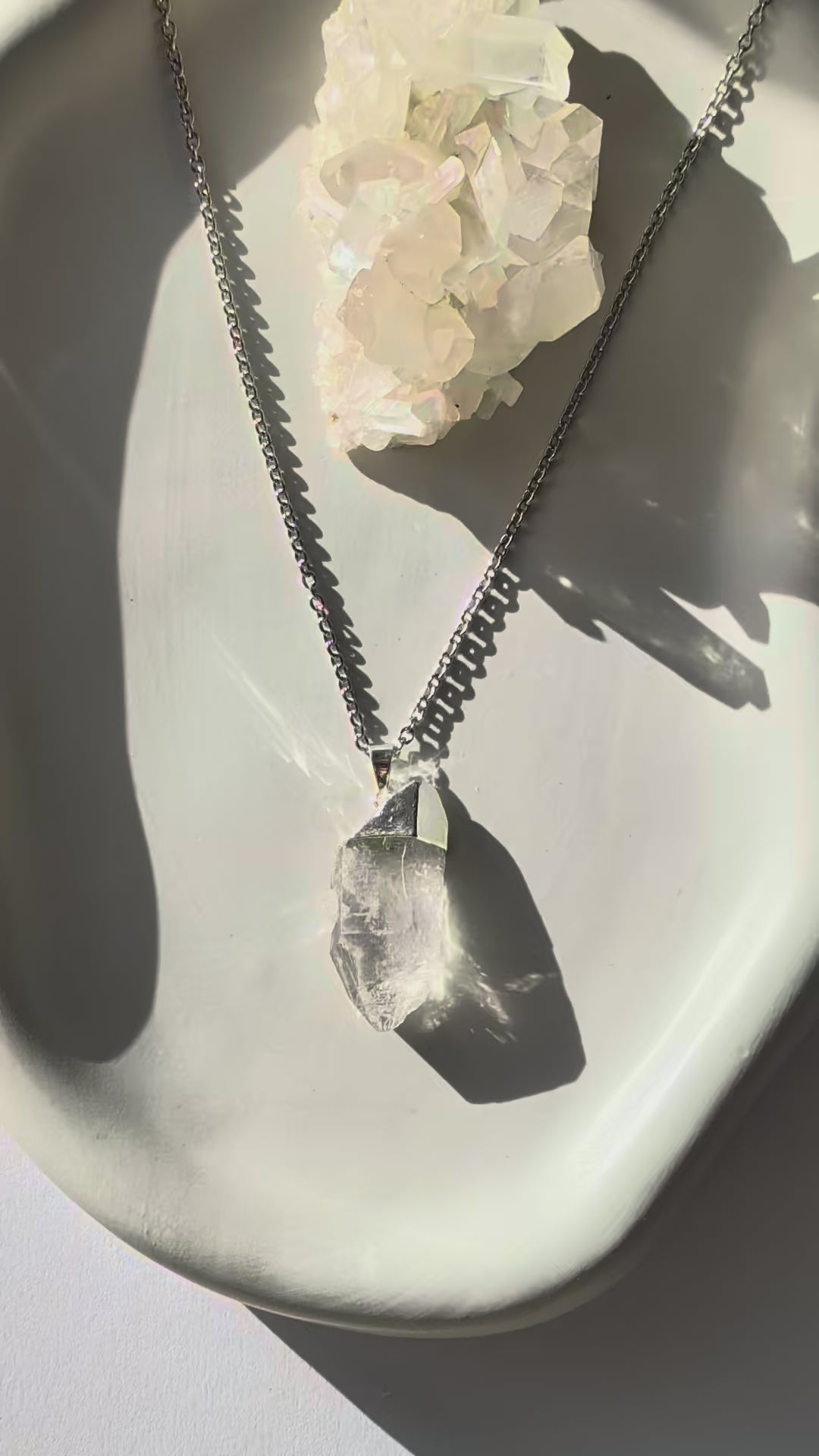 Die Fotos zeigen Beispiele dafür, wie die Kette aussieht. Da wir echte, rohe Bergkristall-Spitzen verwenden, ist kein Stein wie der andere. Deine Spitze wird einzigartige innere Merkmale (Einschlüsse, Wachstumsstreifen etc.) haben – sie wurde von der Natur nur für dich geschaffen.