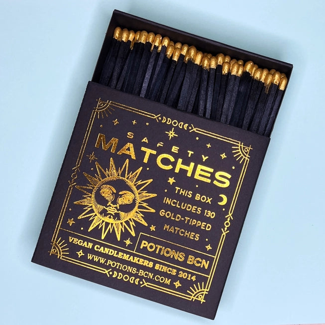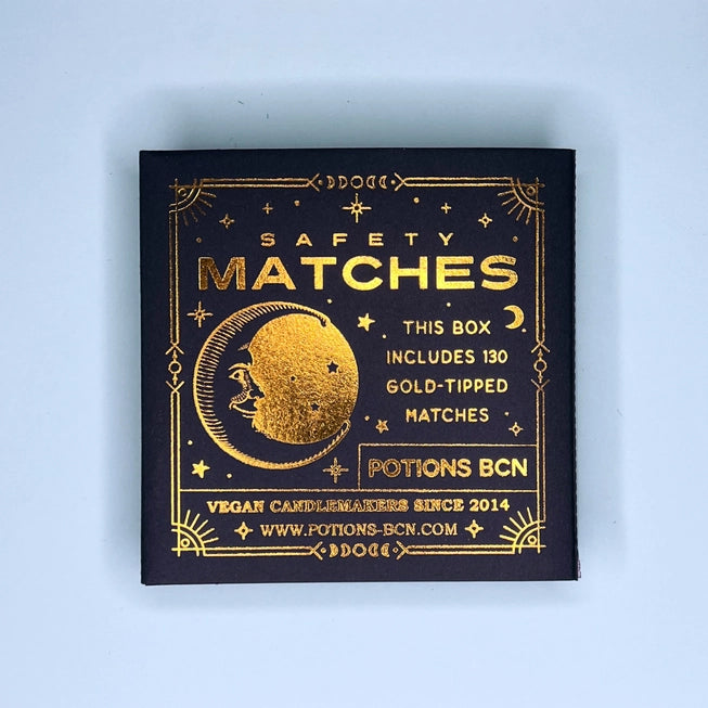 Die "Le Tarot" Premium-Streichhölzer von Potions BCN sind mehr als nur ein Gebrauchsgegenstand. Das tiefschwarze Holz, kombiniert mit dem eleganten goldenen Phosphor, verleiht diesen Streichhölzern eine unvergleichliche Eleganz. Nutze sie, um deine kostbaren Kerzen und Räucherwaren stilvoll und präzise anzuzünden. Anschließend bewahrst du sie in der wunderschönen "Le Tarot" Schachtel auf, die mit einem edlen Golddruck von Mond und Sonne verziert ist und so ihren mystischen Charakter unterstreicht. Doch nicht nur die Ästhetik überzeugt: Diese Premium-Streichhölzer werden umweltbewusst und ethisch verantwortungsvoll hergestellt – mit Bio-Materialien, sind vegan, in recycelter Verpackung verpackt und wurden unter fairen Bedingungen beschafft.