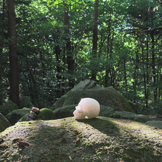 "Mondgeist" ist ein extrem großer, massiver und präzise geschnitzter Schädel aus milchigem Quarz von über 5 kg. Er steht für Reinheit, innere Ruhe und geistige Klarheit.