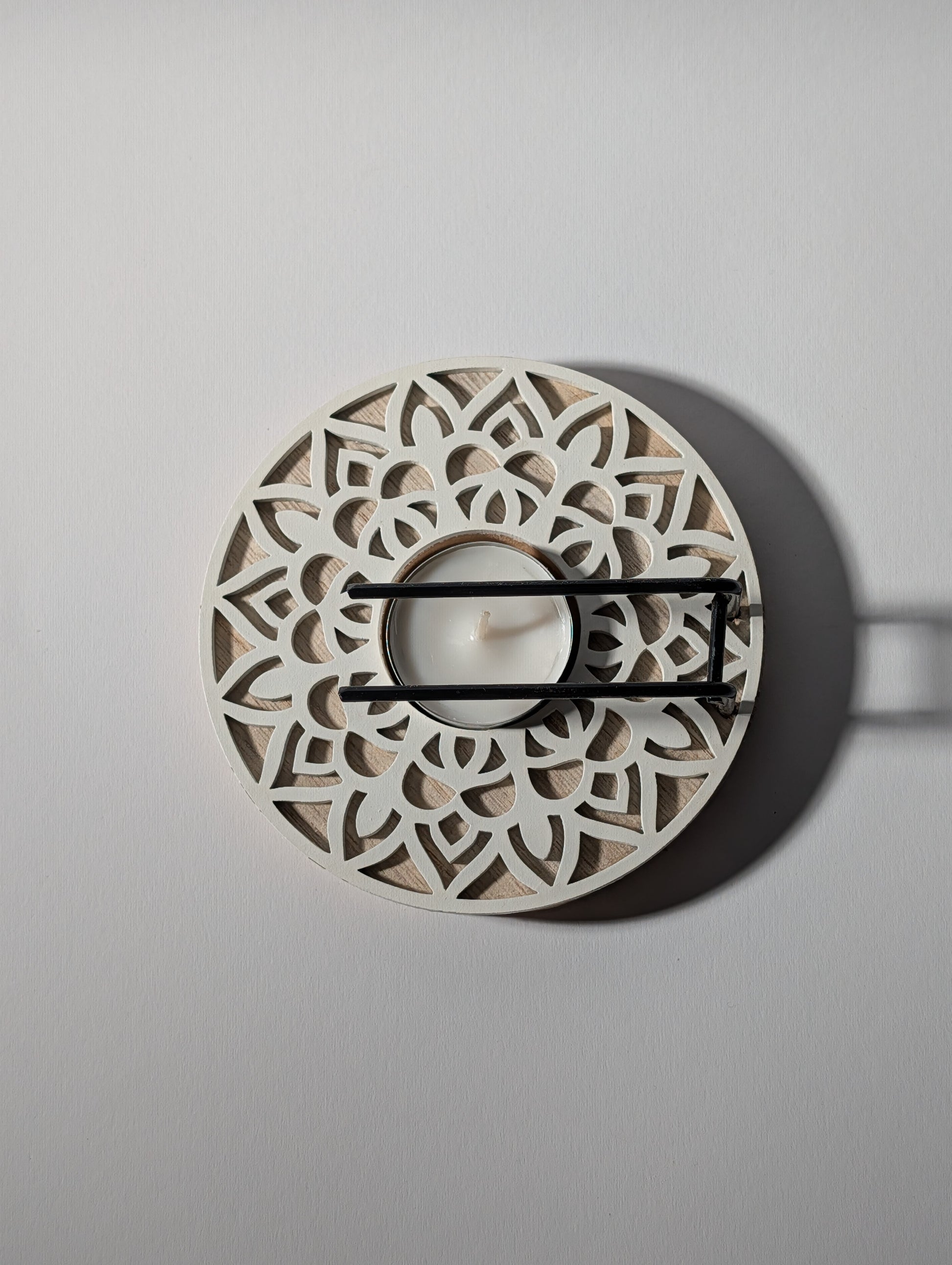 - Design: Rundes Podest mit weißem Mandala-Relief & schwarzem Metallgestell