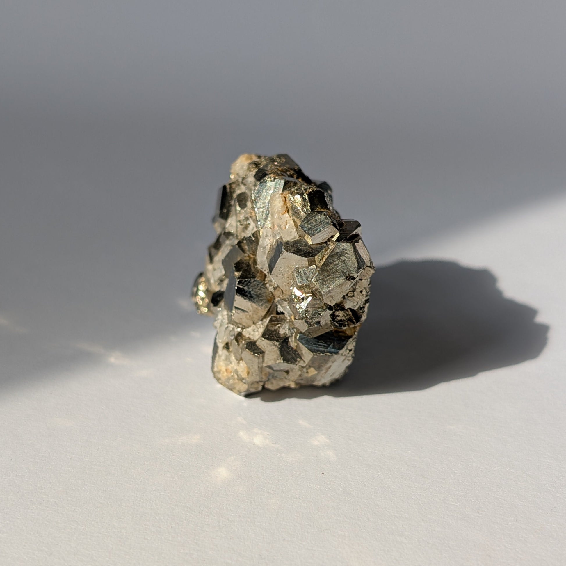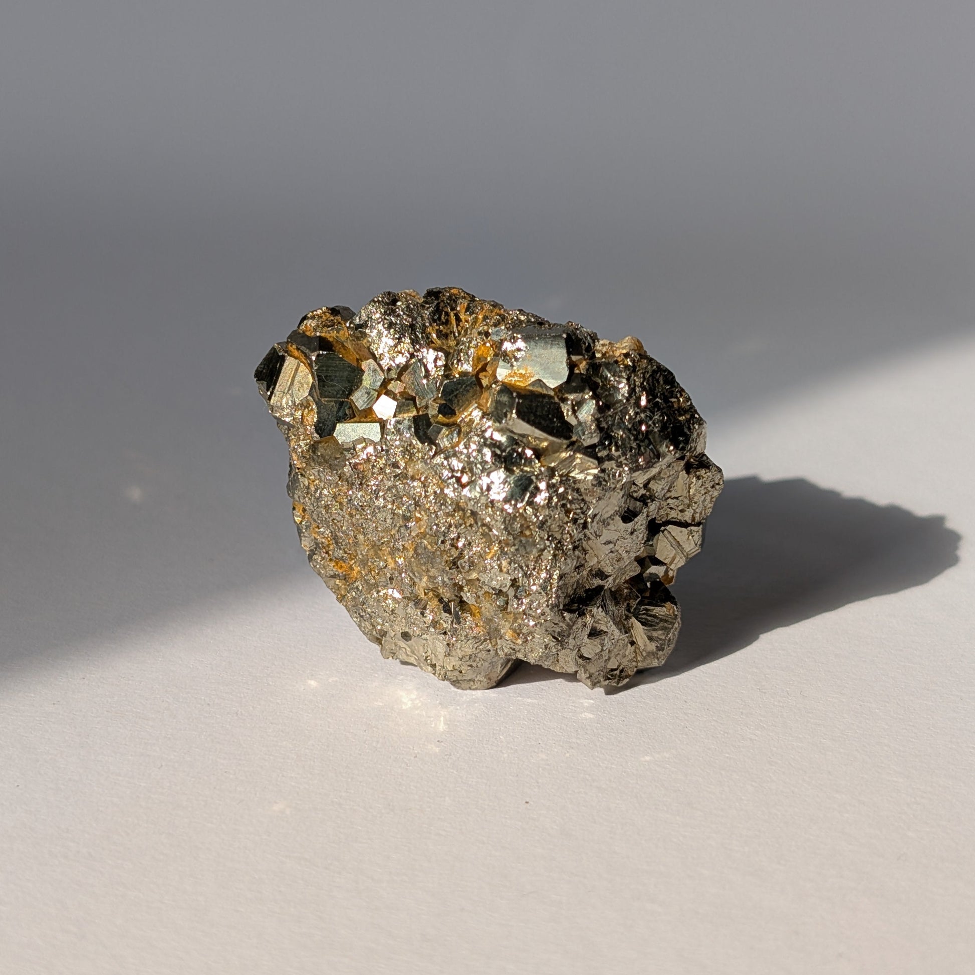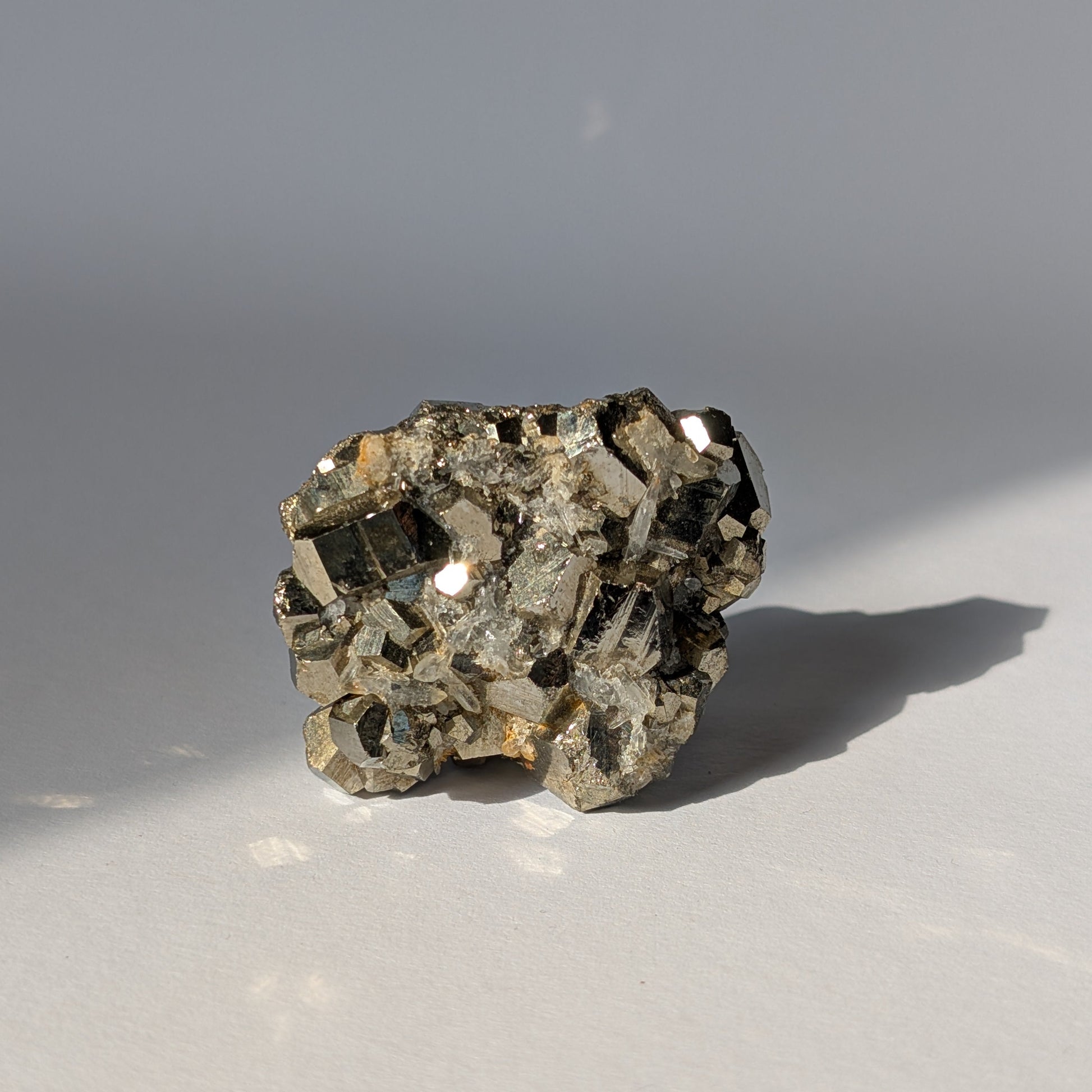 "Die Sonnen-Zitadelle" ist ein wunderschönes, natürlich gewachsenes Kristallcluster. Seine unzähligen funkelnden Facetten machen ihn zu einem idealen persönlichen Werkzeug, um die kraftvolle Energie des Pyrits für Manifestation und Schutz zu nutzen.